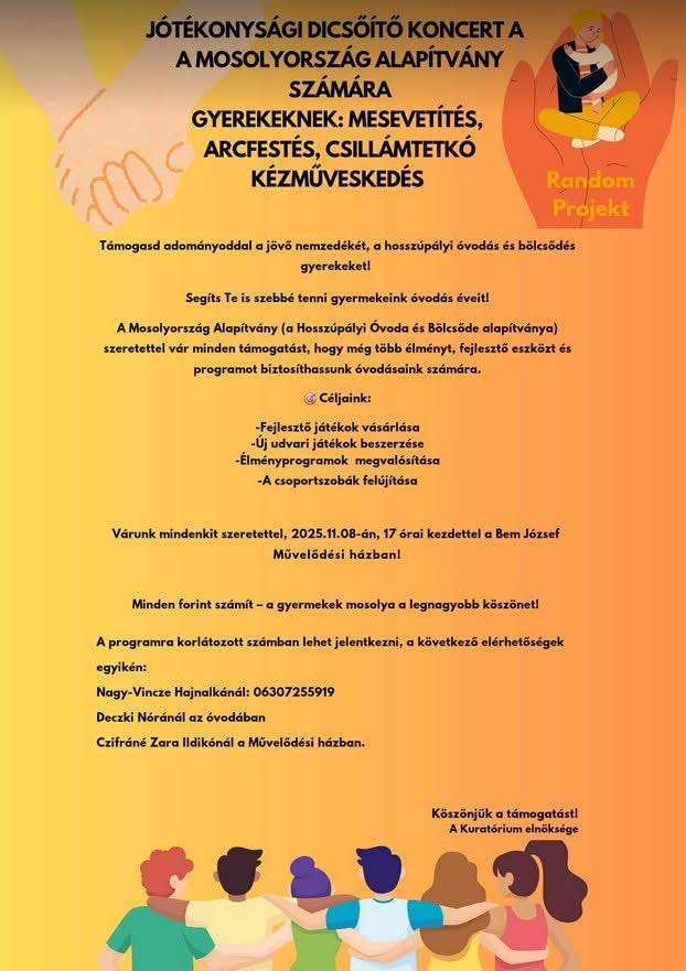 Jótékonysági Dicsőítő Koncert – a gyerekek mosolyáért! Szeretettel várunk november 8-án, 17 órakor a Bem József Művelődési Házban, ahol zenével és szeretettel segítünk a Hosszúpályi Óvoda és Bölcsőde gyermekeinek! Lesz mesevetítés, arcfestés, csillámtetkó, kézműveskedés – igazi családi délután, sok nevetéssel! Támogasd Te is a Mosolyország Alapítványt, és segíts, hogy még több élményt, játékot és mosolyt adhassunk a gyerekeknek!#jótékonyság #koncert #mosolyország #hosszúpályi #ovodaTámogató jegyek az óvodapedagógusoknál kaphatók!